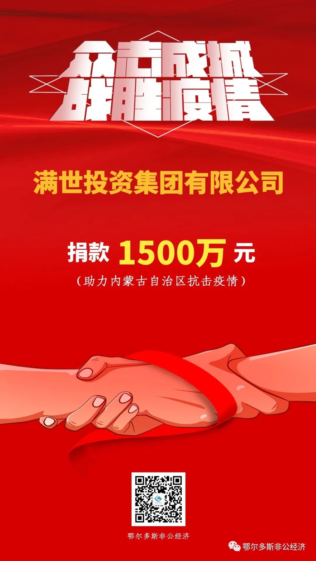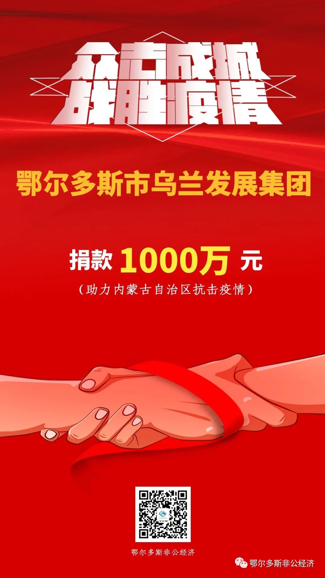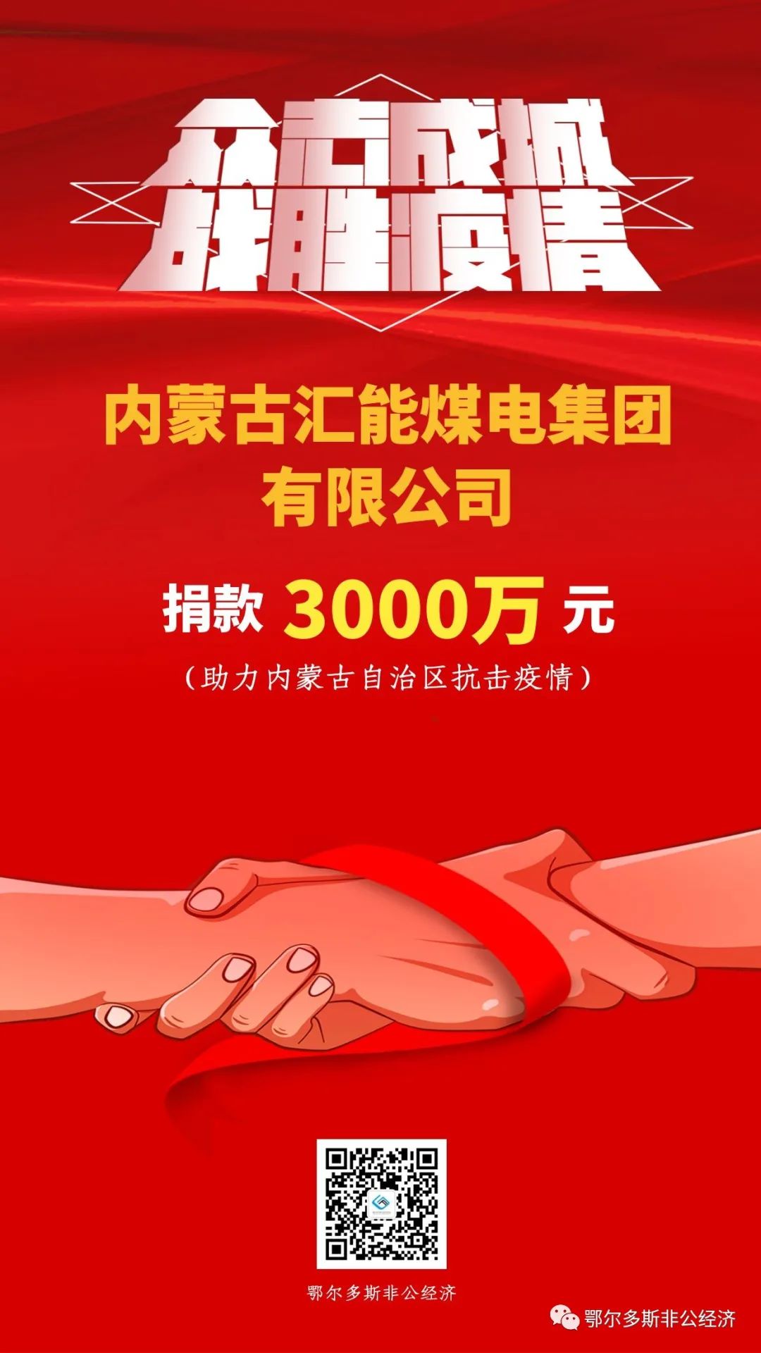 疫情發(fā)生后,我市多家民營企業(yè)聞令而動(dòng),通過捐資捐物全力配合支援呼和浩特市、包頭市打贏疫情防控阻擊戰(zhàn),匯聚起眾志成城、萬眾一心的強(qiáng)大力量。其中,匯能集團(tuán)捐款3000萬元、伊泰集團(tuán)捐款2000萬元、滿世集團(tuán)捐款1500萬元、烏蘭集團(tuán)捐款1000萬元、蒙泰集團(tuán)捐款1000萬元。民營企業(yè)以實(shí)際行動(dòng)書寫熱愛祖國、奉獻(xiàn)社會(huì)、建設(shè)家鄉(xiāng)的家國情懷,彰顯了鄂爾多斯市本土民營企業(yè)的社會(huì)責(zé)任與擔(dān)當(dāng),為堅(jiān)決打贏疫情防控阻擊戰(zhàn)貢獻(xiàn)了力量。
